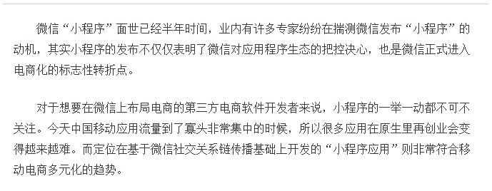微信“小程序”面世已經(jīng)半年時(shí)間,業(yè)內(nèi)有許多專家紛紛在揣測(cè)微信發(fā)布“小程序”的動(dòng)機(jī),其實(shí)小程序的發(fā)布不僅僅表明了微信對(duì)應(yīng)用程序生態(tài)的把控決心,也是微信正式進(jìn)入電商化的標(biāo)志性轉(zhuǎn)折點(diǎn)。