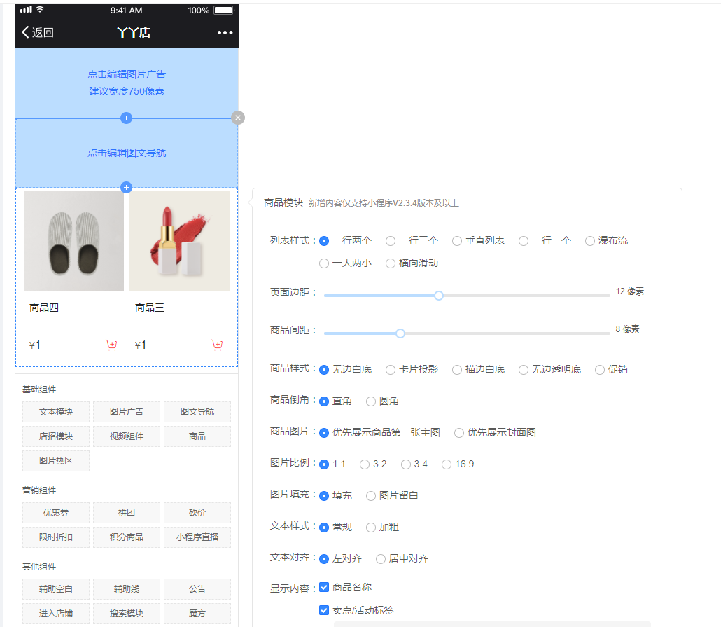 安菲云小程序商城免費系統(tǒng)提供了十幾套各個行業(yè)的店鋪主題模板,選擇適合自己行業(yè)的模板,可直接套用,店鋪推薦商品、營銷活動、店鋪導(dǎo)航等將同步展示。對于不適合的圖片可自由替換,還有主題配色支持選擇,另外還可自定義設(shè)置顏色。