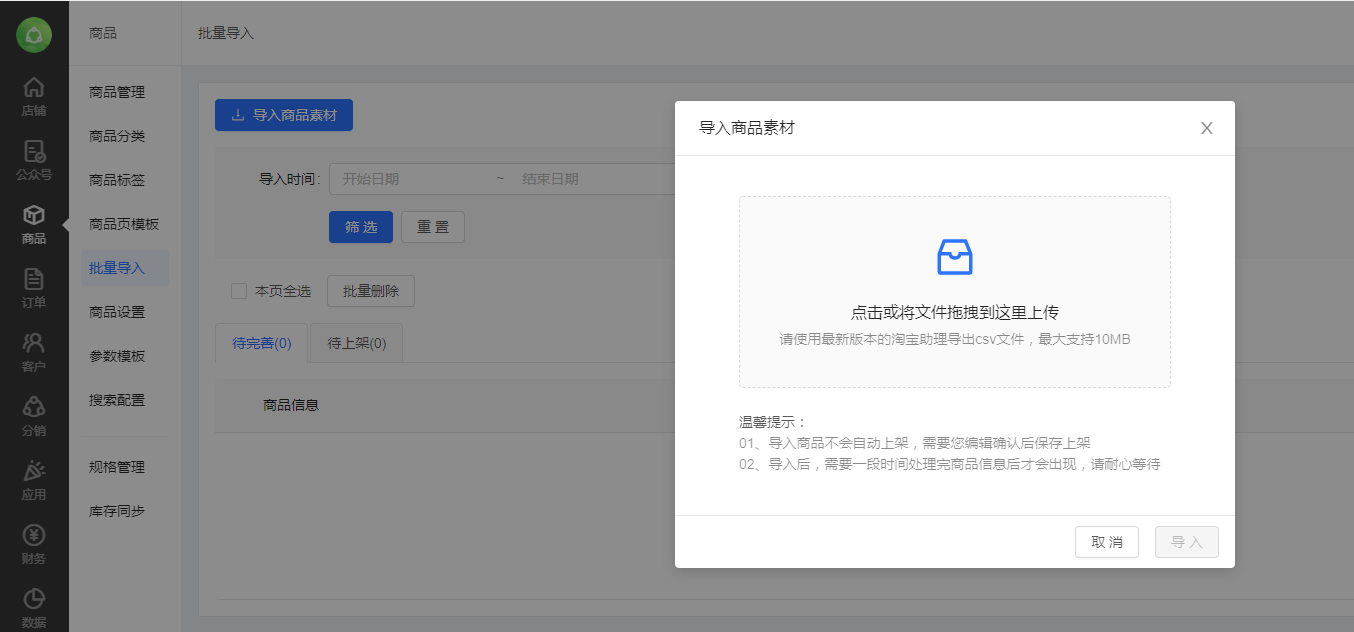店鋪框架與布局設(shè)置完畢,即可上傳商品。安菲云小程序商城支持如淘寶、天貓、愛采購等平臺商品的批量導(dǎo)入,省心省時省力。