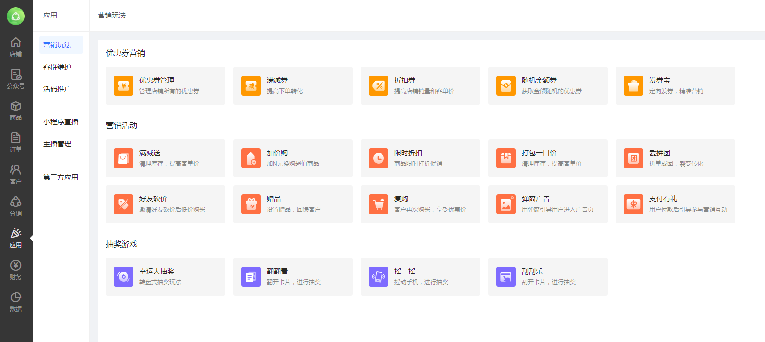 ?、艽蛟斓赇伒臓I銷型,更易留存客戶、豐富營銷玩法、店鋪引流、轉(zhuǎn)化、復(fù)購、裂變、客群維護營銷應(yīng)用盡有。商家可根據(jù)經(jīng)營需求,在不同節(jié)點設(shè)置相應(yīng)的營銷玩法,才能激發(fā)用戶的購買欲。