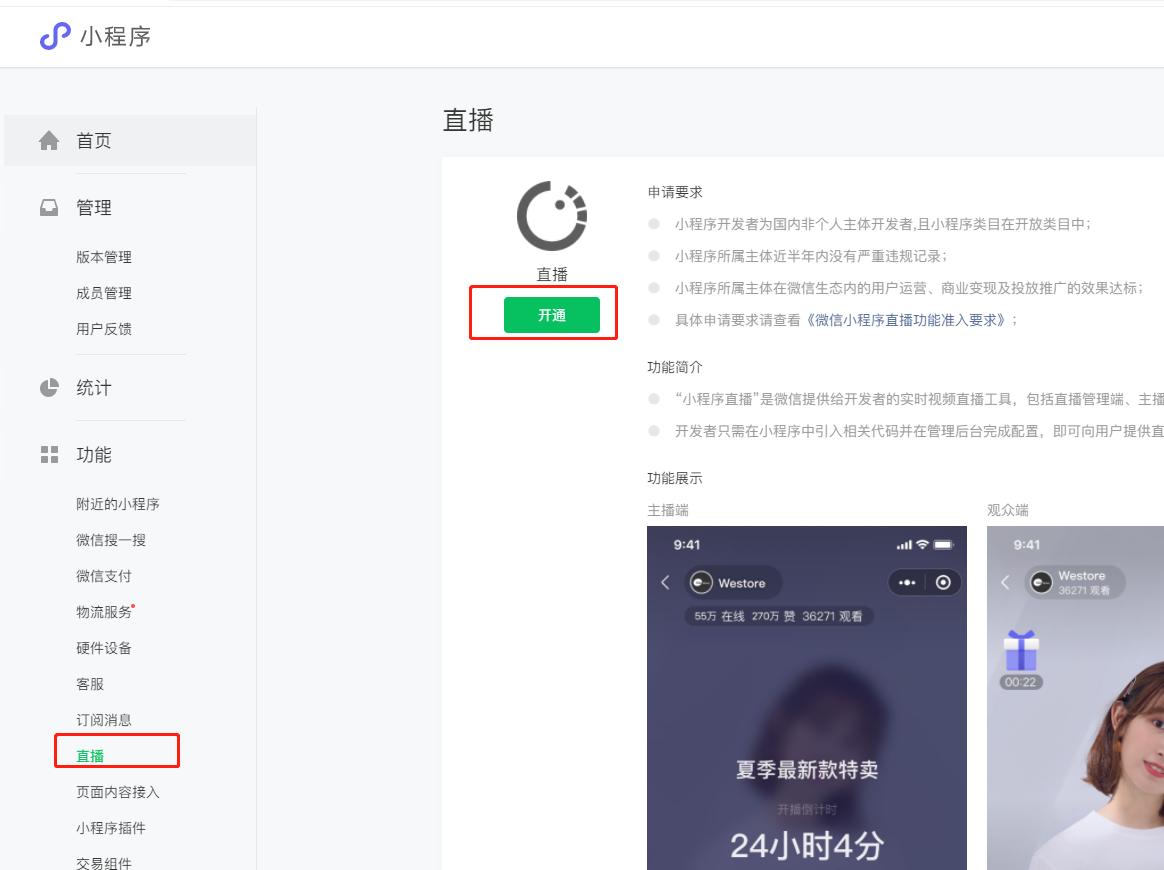4、具體申請(qǐng)要求請(qǐng)查看《微信小程序直播功能準(zhǔn)入要求》