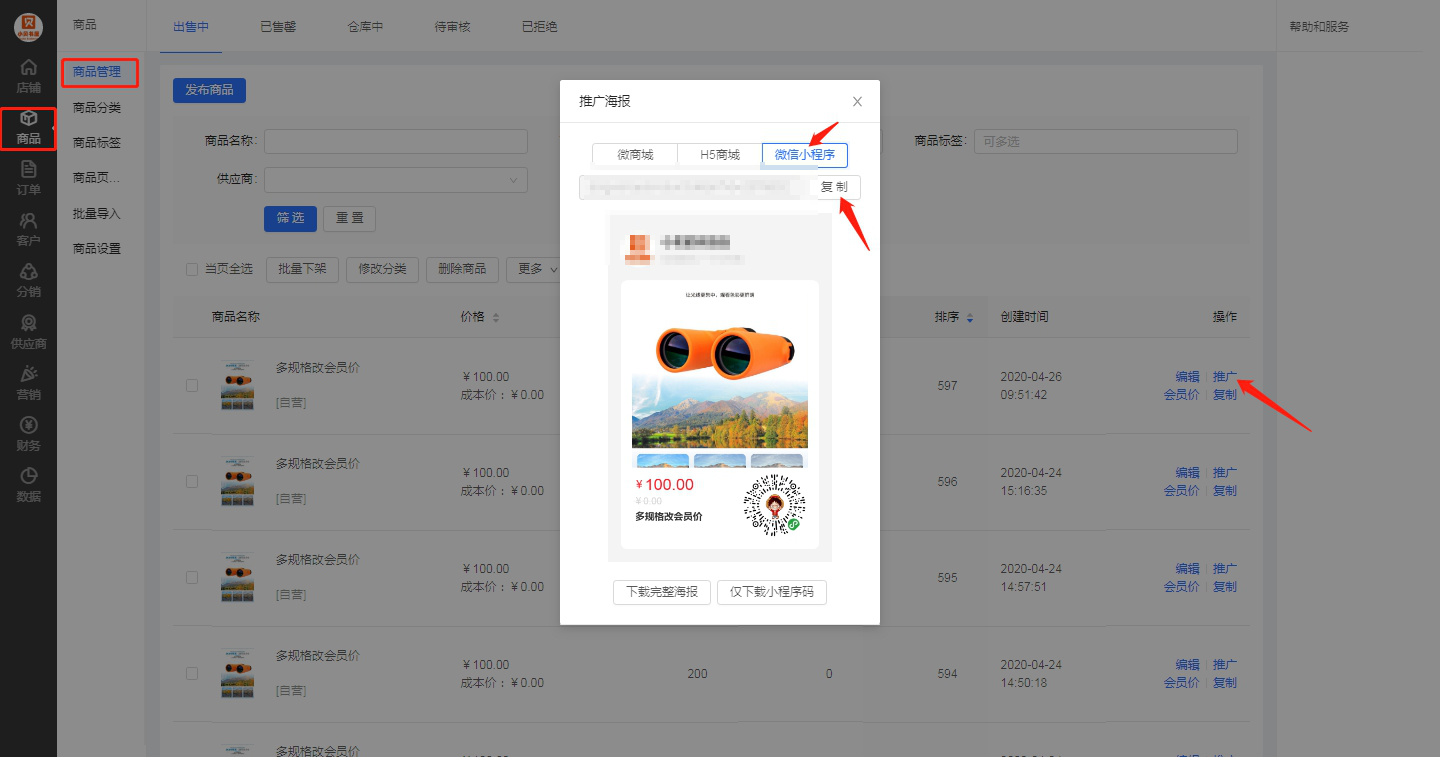 在微信小程序后臺(tái)填寫好了商品信息之后,再進(jìn)入安菲云后臺(tái)復(fù)制商品的路徑,填入路徑即可