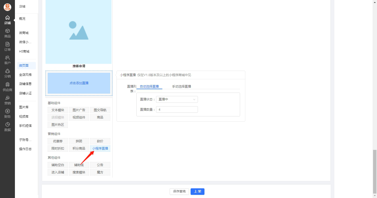 店鋪-微頁(yè)面--編輯--選中小程序直播組件---選擇直播即可