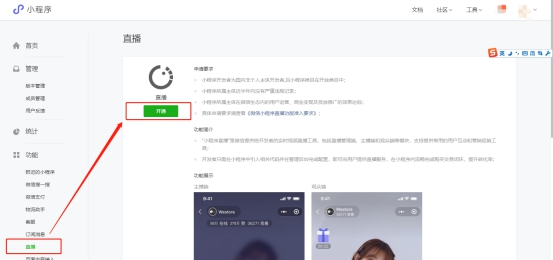 登錄微信小程序后臺https://mp.weixin.qq.com,左側菜單--直播--開通直播,直播開通滿足微信相關類目要求、運營要求。