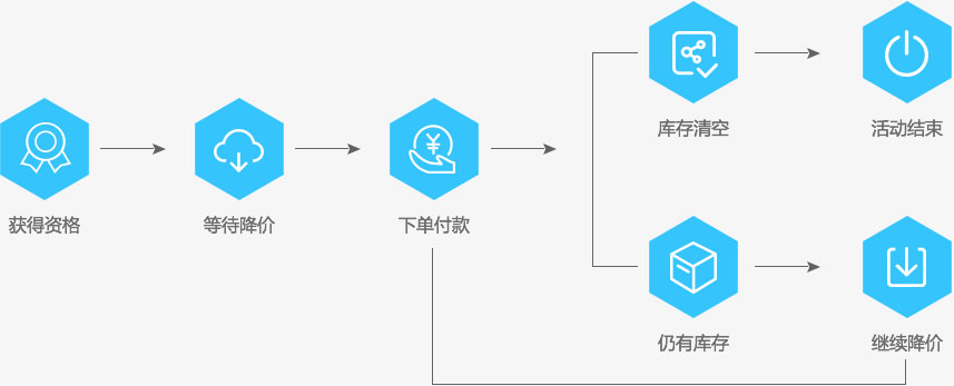 降價拍是一種類似拍賣的營銷利器,商品售價按照既定幅度由高到低依次遞減,直至有買家應(yīng)價付款為止,打破傳統(tǒng)電商銷售模式,幫助商家漲粉促活、提高用戶粘性。降價拍小程序的玩法